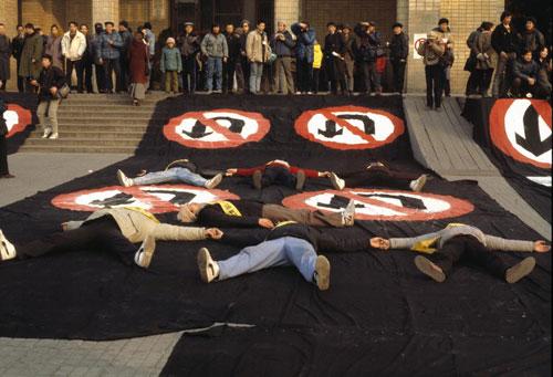 1989年2月,第一个中国现代艺术大展,艺术家们在不准调头的标识上展示创意。