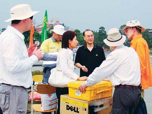 吴忠明(右三)向澳方检疫专家介绍施药器原理性能