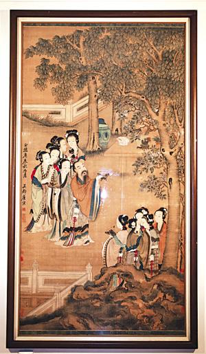 居住在法国巴黎的法籍华人曹先生藏有一幅明代唐寅的绢画。此画高近200厘米,宽100厘米。画中一位贵人和10个仕女,在春光明媚的花园里戏蝶。园内梨花似雪,空中蛱蝶飞舞,贵人神态不俗。画的落款是:吴郡唐寅。下面盖有“南京解元”印章。作画的时间是:正德庚辰秋九月。此外,画上还有好多位收藏者盖的印章。在苦苦揭秘这幅名画过程中,收藏者在万里之外偶然发现唐寅一首藏诗,与名画可谓绝配。经查,此诗竟来源于丹阳孙氏家谱。