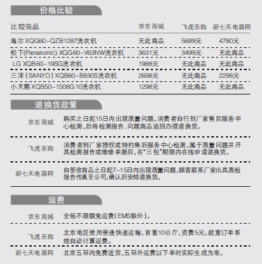 双节将至,准备喜结良缘的情侣们纷纷在节前的黄金时节购置家电。洗衣机是居家过日子必备的家电,为了给消费者节约更多的时间,本期记者将对比京东商城、飞虎乐购、新七天电器网3家网站,帮您选购物美价廉的洗衣机。