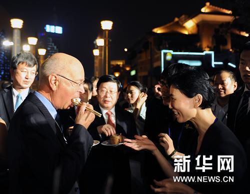 9月14日晚,在天津意式风情区,世界经济论坛主席施瓦布(左)在文化晚宴上品尝天津狗不理包子。当晚,世界经济论坛2010年新领军者年会(第四届达沃斯论坛)举行盛大文化晚宴。