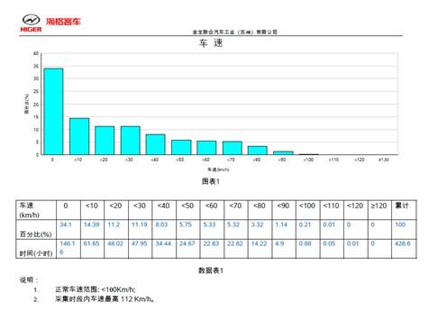 从下列图表分析,可发现王师傅驾驶的车辆运行低速区域较多,平均车速偏低,这是因为国道路况复杂所致;同时,根据发动机转速图表分析,小于800转/分钟的比例占到了33%,而在经济转速的区域相对较少,如果减少车辆怠速时间,提高经济转速比例便可以有效降低油耗。