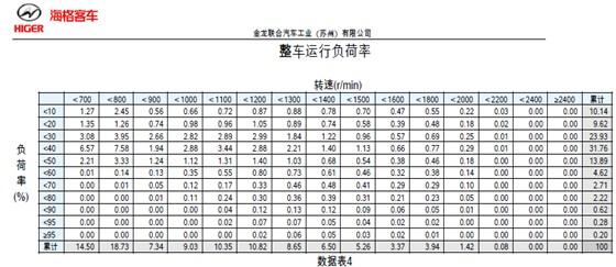 从整车运行负荷率图上可看到,该车辆低负荷率占比太高,同时在发动机的非经济转速区域内的的低负荷率占较高,如果提高整车的负荷率特别是提高经济转速区域内的负荷率亦可以有效降低油耗。
