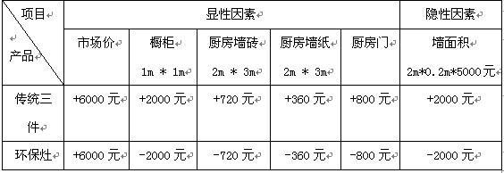 按照国内住房最低水平计算,厨房墙长2米,高3米,厚0.2米,房价5000元/平方米,集成环保灶要比传统厨具节省5880元以上。具体见下表:
