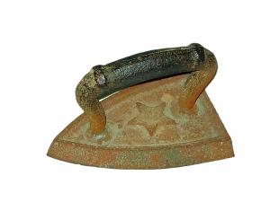 熨斗也被叫作烙铁,它的功能与烙铁一样,在炉火上加热后,用来熨烫衣物、布料。这种实心铸铁的熨斗,从民国以后比较流行,成为百姓家庭的日常用品。在我的记忆里,我童年时代家里就有这么个铁熨斗,一直用了好几十年。过去衣服少,如有一身儿像样的衣服就不错了。所以,有个串亲访友或什么出头露面的活动,都是头天晚上把衣服洗了,第二天一大早儿,现用熨斗把衣服熨烫板正了再穿。熨衣服是个技术活,还得细心。我经常看到母亲在熨衣服前,先用半湿的毛巾放在要熨烫的衣服上,烧热了熨斗后,拿起来靠近自己的脸试一试温度,感觉合适了,这才开始熨烫衣服。