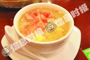 有人问,榴莲本属燥物,炖鸡汤岂不很燥热?其实不然,榴莲与母鸡一起炖煮成汤后,不但营养价值十分丰富,而且补而不燥,适合不同体质的人饮用,秋冬吃最合适不过。80元/盅的榴莲鸡汤,在餐厅非常受食客欢迎,由于其每天所售的数量有限,有时来晚了还不一定能喝得上呢。