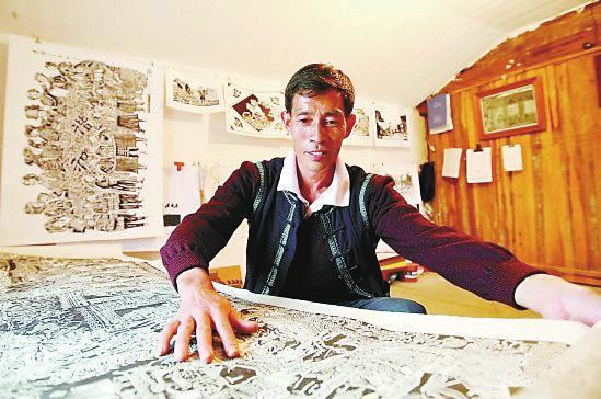 在展厅里最显眼的一幅画,占了半面墙壁,描绘了壮族的物质文化生活及各种民俗风情。它长1.8米、宽0.8米,是卢老和另外一位名叫龙子辉的农民版画家花了两年时间共同完成的。场面恢弘大气,其壮观景象不亚于《清明上河图》。