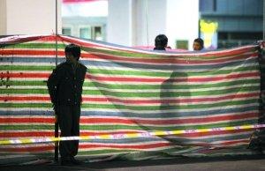 警戒线内一摊血迹清晰可见。血迹往东约20米处,就是980路乘车口,地上同样可见大片的血迹,多名刑警围在血迹旁拍照取证。在通道的栏杆上,到处可见血迹斑斑。在980路站台东南侧的车场内,临时竖起围挡,多名警察、保安守在外面,围挡内也有民警正在勘察。