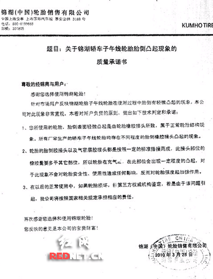 那为何不断有轮胎“鼓包”的投诉呢?在红网记者的追问下,厂方出示了一份《质量承诺书》。这份落款为“锦湖(中国)轮胎销售有限公司”、盖有公章的传真件,对轮胎出现“鼓包”进行了详尽解释。