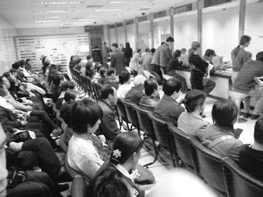 大堂经理忙解释:“对不起、对不起,人太多,我们也没办法!您看看,柜员们的嘴唇都是裂的,不敢喝水,怕去厕所。女柜员吃饭都狼吞虎咽的,就是怕客户等着急啊!”刘女士叹了口气,找了个座位坐了下来。记者看到,大厅里不少客户,有的带着书报,有的玩起了手机,显然都作好了“持久战”的准备。