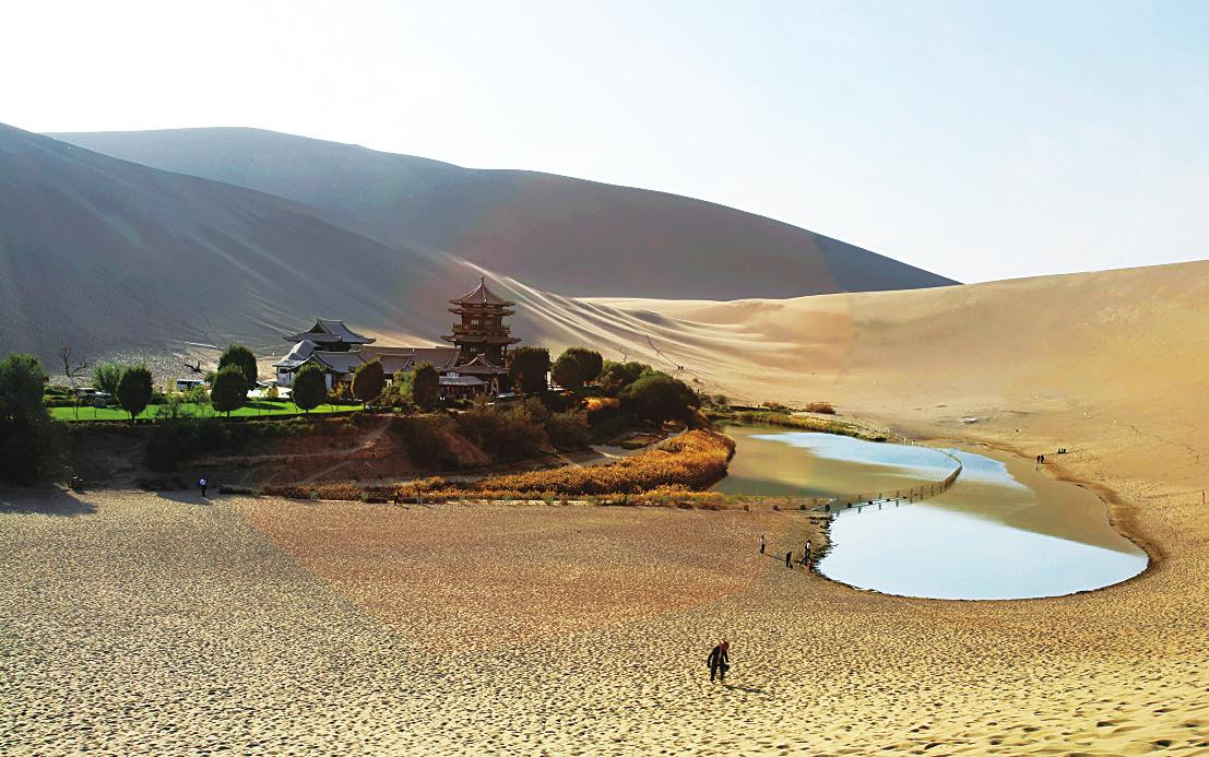 月牙泉在鸣沙山下,古称沙井,俗名药泉,景区内的罗布麻、枸杞等药材很多,自汉朝起即为“敦煌八景”之一,得名“月泉晓彻”。月牙泉南北长近100米,东西宽约25米,泉水东深西浅,最深处约5米,弯曲如新月,因而得名,有“沙漠第一泉”之称。近些年来,由于缺水,月牙泉的面积持续缩小,水深也在缩短中,只能依靠“人工输液”来维持。这一沙漠中的奇观,不知还能保存多久。