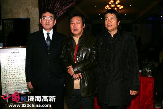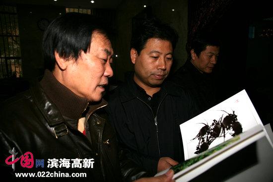 天津著名画家王峰在签名售书现场与天津滨海高新区工委宣传部部长王会臣交流.