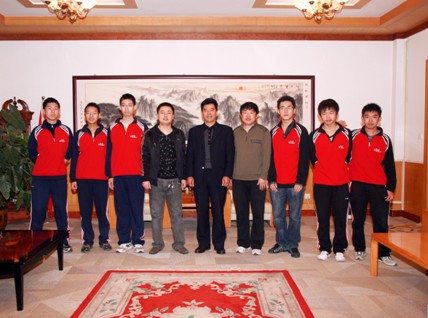 左起 陈鑫 王贺明 姜一君 王青林(教练员) 刘春普(校长) 鞠金路(教练员) 牟刘杉 丁治宇 孟祥一