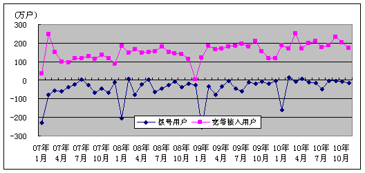3.互联网用户:基础电信企业的互联网用户进一步趋向宽带化。2010年1-11月,基础电信企业互联网宽带接入用户净增2091.1万户,达到12488.9万户,而互联网拨号用户减少了142.1万户。
