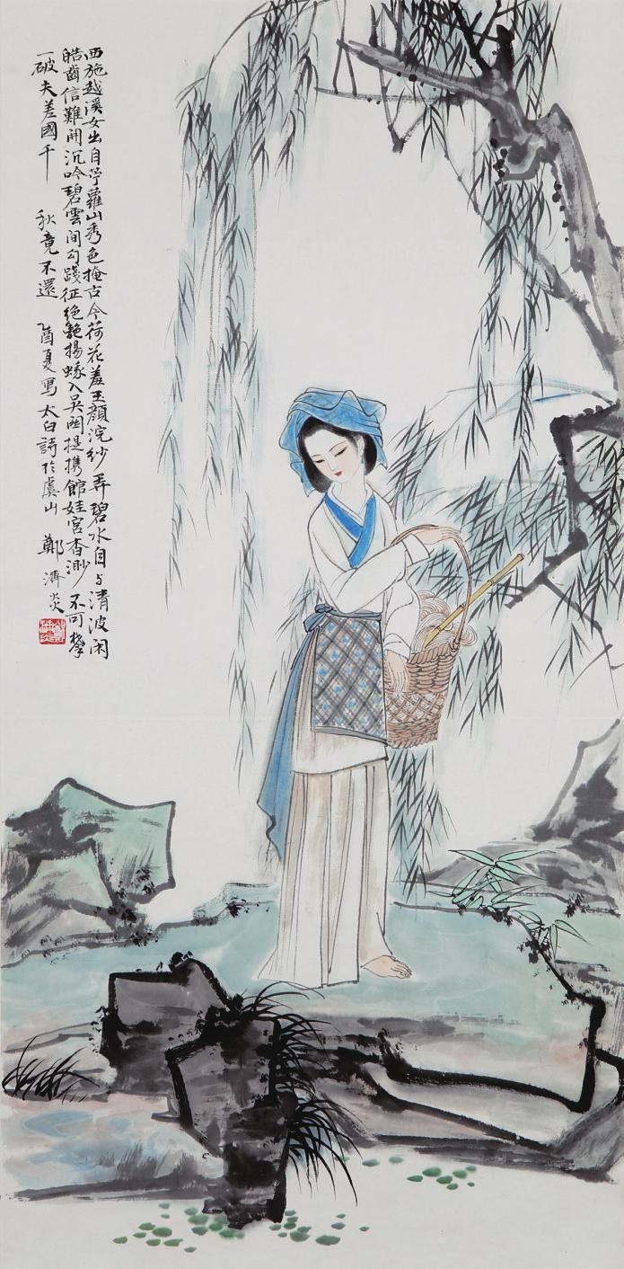 《西施图》就是颇能体现郑济炎近年来艺术风格的一幅佳作。西施为古代四大美女之一,这样的题材历史上画的人很多,而郑济炎所画的西施充分体现了他的仕女画之特色——“清新脱俗”。画中以杨柳与溪石为背景,在依依杨柳与溪边嶙峋怪石的衬托下,人物与周围环境融为一体。浣纱女着一身素衣,戴着蓝色头巾,围着半截短裙,手挎竹篮,具有纯朴的乡土气质,完全没有一般仕女画中所绘的那种千娇百媚状。眼神中带一点儿纯真,带一点儿伤感,似乎使人联想到了她的身世与故事……难怪人们都说郑济炎所画的人物,清新脱俗不食人间烟火,深受人们喜爱。在这幅作品中,粗犷的溪石与柔美的垂柳、人物形成对比,用墨深重处却不显滞板,清淡处却不显浮华,体现了郑济炎深厚的艺术功底。可以看出,他的画在成功借鉴和继承了前人与老师的精华后,形成了自己独有的风格。