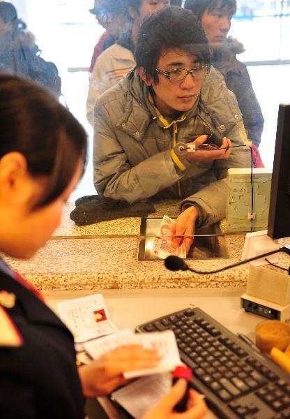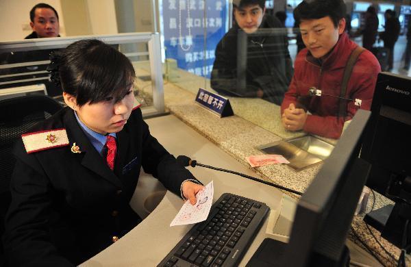1月10日,旅客在武汉火车站排队购票,售票员在检查其身份证件。新华社记者 郝同前 摄
