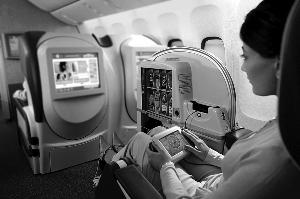 卡塔尔航空则主打在云端的通讯服务,利用座位上的机上娱乐主机,那也是个人迷你商务中心,可以处理登机前在世界各地机场的卡航休息室,使用无线互联网未完成的工作,也能实时掌握国际资讯。座位上也备有笔记本电脑电源插座和可调式个人阅读灯。