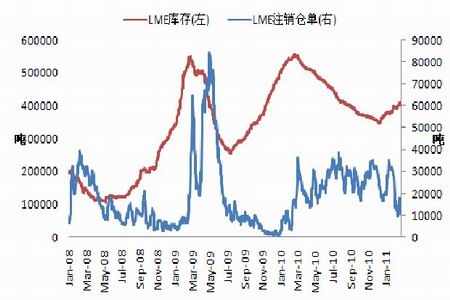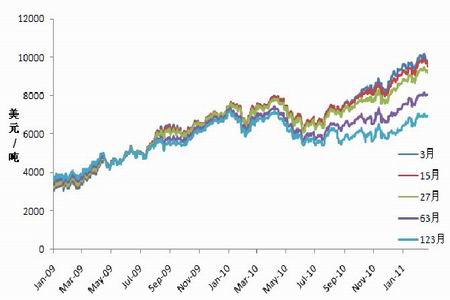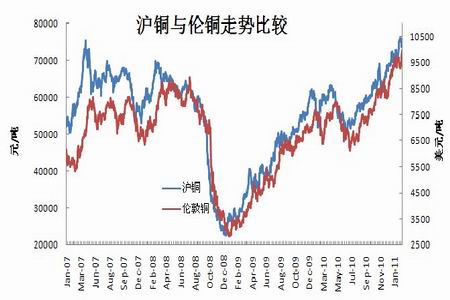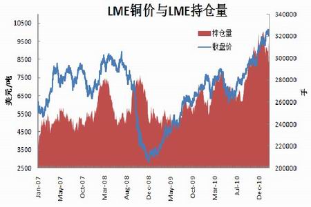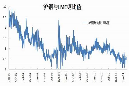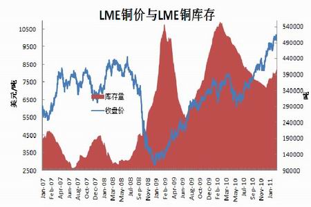 进入2011 年铜价依旧维持了震荡上行走势,在2 月初,伦铜创下了10160 美元/吨的历史新高,随后震荡回落,美国经济数据的走强以及对于铜供应缺口在2011 年将扩大是铜价上涨主要动因,中东地缘政治的波动及国内回收流动性打压了铜价上涨势头。