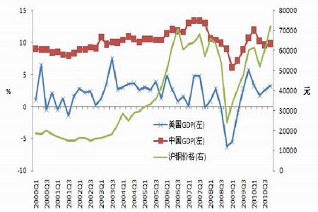 图 2-1:2000 年至今中美GDP 季度增长率与铜价