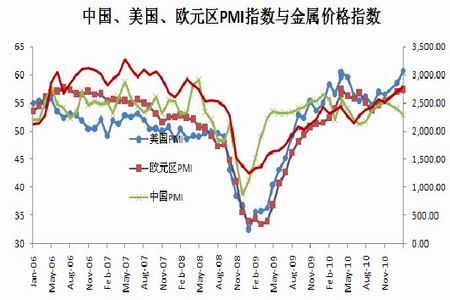 2011 年2 月1 日中国公布的制造业采购经理指数(PMI)为52.9%,比上月回落1.0 个百分点。继上年12 月份以后,1 月份PMI 指数继续回落,表明近期经济回稳的趋势还不明确,存在继续回调的可能。综合来看当前经济运行仍处于调整状态,各项调控政策将密集出台,近期各有色金属价格将会震荡加剧。