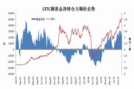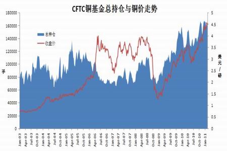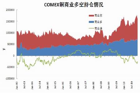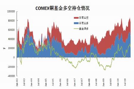 由2011年2月21日公布的CFTC公布的最新美期铜持仓数据可以清晰看出,COMEX期铜持仓单周减仓3000余手,总持仓创下历史新高后小幅滑落,目前仍处于高持仓范围之内,基金净多头持仓由1月底23912手上升至29039手,基金净多头持仓兴趣出现上升;2月21日,总持仓159468手;基金净多及基金总持仓维持较高水准,显示基金后期对铜市仍报以乐观态度,短期调整后仍有望继续延续涨势。