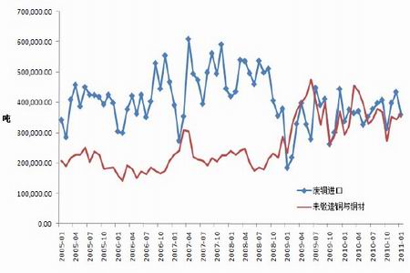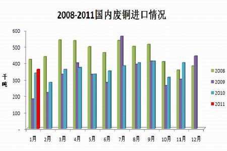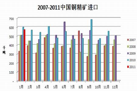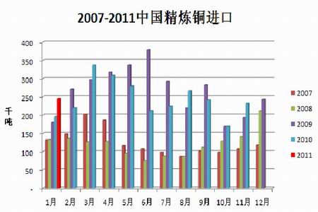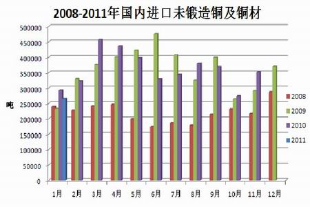 海关公布消息显示:1 月份中国未锻造铜及铜材的进口量为36.42 万吨,环比2010 年 12月份的 34.46 万吨增加了1.96 万吨,增幅为5.71%,同比增幅高达24.70%。中国1 月精炼铜进口245,616 吨,同比增幅达到24.5%。而2010 年12 月的进口量为228,609 吨。中国1月铜精矿进口较去年同期减少4.3%,至571,005 吨。中国1 月铜精矿进口量较去年12 月的485,055 吨增加18%。