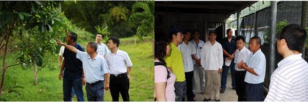 (商务部领导、经商处负责人许奎在项目组专家的陪同下视察果树资源圃并亲切交谈)