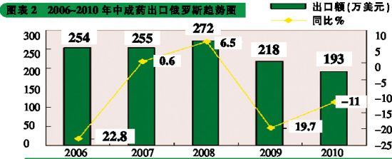 虽然中医药在俄罗斯发展缓慢,但是,俄罗斯的中医药市场却有很大发展潜力。海关数据显示,我国对俄罗斯的中药类出口主体为贸易公司。2006~2010年,中国出口到俄罗斯的中药类产品大约在400万到700万美元之间,增幅波动较大。其中植物提取物和中成药是主要的出口品种,植物提取物每年的出口金额约在400万美元左右,中成药出口则在200万美元上下。但是通过边贸、私人携带等方式进入俄罗斯的却远不止这些。