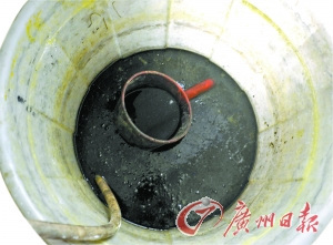 一个装有石蜡的缸边,竟然写有一行警告员工不得倒掉“老料”(用过的石蜡)的“提醒”(见上图),这些石蜡散发着恶臭。