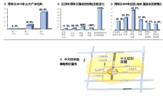 作为中大纺织商圈的后起之秀,珠江国际纺织城以90万平米庞大体量、40亿巨资投入,成为商圈内全新地标级建筑。众多“行业首创”、“行业第一”的光环,令珠江国际纺织城承载着更大的行业使命:项目被广东省、广州市、海珠区三级政府指定为重点建设项目,是推动实现省市区三级政府建设“中大布市千亿商圈和全球纺织品展贸中心”的重点项目。
