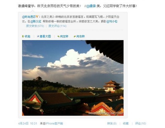 转发的时尚芭莎官方微博截屏图,照片是在建福宫上所拍