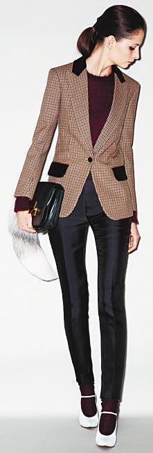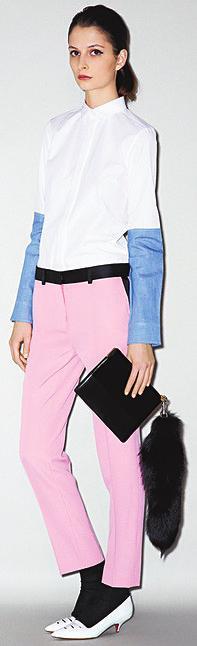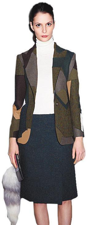 强烈的混搭营造出雕塑感,FramisTape工艺掩盖了内在缝线,全新的复合技术完善了细节,裙装或上衣中加入了如夹克般的马毛胸饰,激光切割皮革饰边,拼接与色块。格纹大衣、格纹衬衫与格纹长裤叠穿,仅靠面料的光泽与颜色的细微差别营造出层次感;深浅不一的原色牛仔面料拼接出几何色块,或是与格纹呢相互拼接;棕色系与绿色系不规则色块的拼接被创意总监PhoebePhilo称为“都市中的伪装”;泛着绿色金属光泽的斗篷式大衣;剪裁流畅没有任何多余细节的豹纹大衣;祖母绿与孔雀蓝拼接的裤脚加上红色点缀的裤腰,黑色衬衫与九分裤的搭配瞬间变得额外生动;袖口拼接蓝色牛仔面料的白衬衫搭配粉色长裤,大胆撞色为Céline的极简主义平添了几分乐趣与活力。
