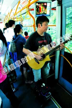 这个流浪歌手是阿凡,他告诉记者,像蒋先生这样的“歌迷”还有很多。他们有些是在公交车上听到他的歌声,因为听他的歌甚至忘了下车坐过站,有人则是固定到街头听他唱歌,一直听到他“收工”时去与他认识的。来广州四年多,阿凡曾在天河、海珠、番禺的街头和地铁通道里唱歌。而每次从出租屋去“表演地”时,他总是会坐公交车,有时公交车上乘客不拥挤时,他就在公交车上弹唱起来。“也有公交司机和乘客不满叫停的,但大部分时候大家就任我唱一会儿,有人还会塞钱过来。”
