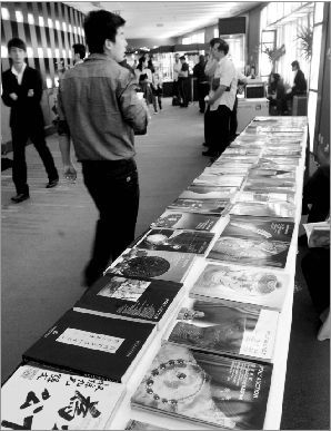 北京保利2011春季艺术品拍卖会场外,各种拍品图录琳琅满目。新华社 图