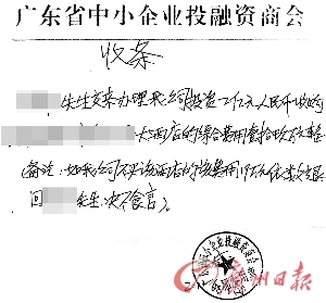 5月29日,王威“代表”商会,和张先生亲赴湖南,和酒店方法人代表签订了投资合作合同。王威表示,酒店方必须先支付19万元的服务费给商会,达成交易后,再在投资款中扣取5%的投融资担保咨询手续费。由于酒店方不愿在收购资金到账前支付任何费用,为了促成交易,张先生决定个人先垫资19万元。交了钱后,王威在商会办公室内给其开立了加盖有“广东省中小企业投融资商会合同专用章”的收条。