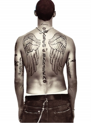 爱老婆、爱孩子,敬老人,从另外一个地方也可以看出来,那就是文身。和小贝一样,想在马特拉齐身上找块“净土”可没那么容易,尽管只有12块,比小贝少了6块,但他已经是意甲拥有最多文身的球员了。而他的文身主题没有小贝的那么乱,马特拉齐的文身凸显恋家:背上文着一对天使的翅膀,是因为他的长子在一幅送给父亲的肖像画中将其描绘成了天使;他的后颈文着ANNA,那是他早逝的母亲的名字,后来他又将这个名字给了自己的女儿;在脊柱处还有他自己的名字MARCO和妻子的名字DANIELA,以此见证二人忠贞的爱情;其余各处的刺青也多和家人相关。