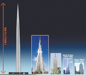 沙特阿拉伯将耗资300亿美元在红海东海岸的吉达市北部20公里处建造世界第一高楼“国王塔”,因为其高度将达到1英里(1609米),所以又称“英里塔”,是集合酒店、写字楼、住宅公寓为一体的超级摩天大厦。
