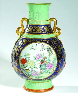 那么这两件作品是否真的值那么多钱?恐怕未必。这从拍卖行开出的不过6000~8000美元的估价中便可以看出。1800万身价的那件瓷瓶,甚至连苏富比都对其出处不甚清楚,仅仅谨慎地标明“类属民国”,而且中文名称也多少有些含糊——“描金印花粉彩开光壶”。此件瓷器的状态报告说,瓶身与底足断开又粘合上,瓶口及耳朵鎏金部分有些磨损。品相并不精良。