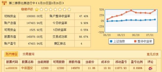 在经历了两次小幅度止损后,选手“江鸟”将目光瞄准市场热点—锂电池板块。他并没有出击已经大幅走强的品种,而在7月1日早盘9点35分介入股价超跌后刚开始回升的中信国安。中信国安今日强势涨停,选手“江鸟”也因此捕获第二赛季的第五个涨停板,整体收益率快速回升至排行榜前列。