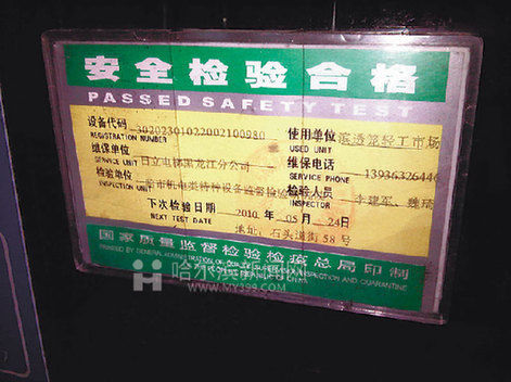 记者在透笼轻工批发市场看到,四至六层的4部扶梯上都贴着“西子奥的斯”商标,但记者只看到两张“安全检验合格证”,其上的“下次检验日期”是“2010年5月24日”。由此可证明,该扶梯已一年多没有被质检过。该商场4至6层客流量大,6层是儿童玩具批发区,很多妈妈抱着孩子乘坐扶梯,还有老人、儿童独自站在扶梯上。
