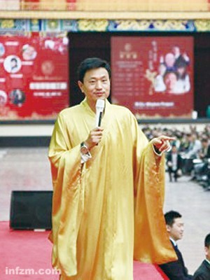 终于,音乐与掌声中,38岁的刘一秒在十几名男子的簇拥下走上舞台。他身高一米八,一身白衣,半侧着身,仰面45度环视全场,掌声更猛烈了。一分钟后,他把手抬到半空,示意学员们就坐。