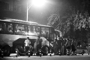 8月7日晚10时,途经北京的外地正规大巴车在北蜂窝路揽客,等待从西站来的旅客上车。