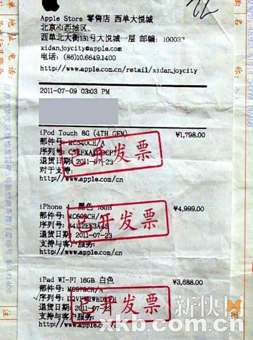 在王海16日发布的博文中显示,消费者刘女士和吴女士分别于今年7月9日下午,在西单大悦城苹果AppleStore零售店,以4999元的价格各购买了黑色16G的i-Phone4手机各一部。王海在博客上公布了购物小票。