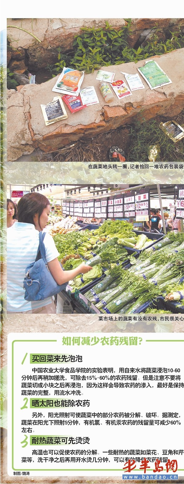 谈到目前农民用药缺乏有效监管、指导的问题,工作人员说,他们也通过多种方式对此进行规范。“由于农户太多,而我们执法人员又少,因此无法监管到每一户、每一片粮食、蔬菜,对用药量、次数也难掌握。为此,每年我们都会通过送科技下乡、赶农业大集、办培训班等方式,加大对农民科学用药的宣传。像农技推广部门、地方政府,都应对农民用药更加关注,只有从基层抓起,才可能从源头上杜绝问题出现。”文/图 记者 李伟伟 见习记者 孙祥辉