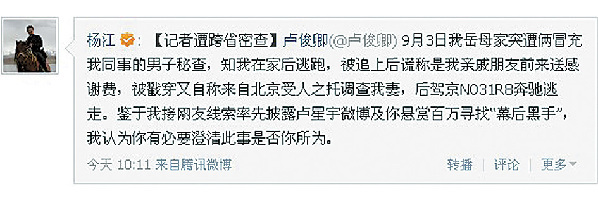 杨江立刻在微博上公开联络卢俊卿,认为“鉴于我接网友线索率先披露卢星宇微博及你悬赏百万寻找‘幕后黑手’,我认为你有必要澄清此事是否你所为。”