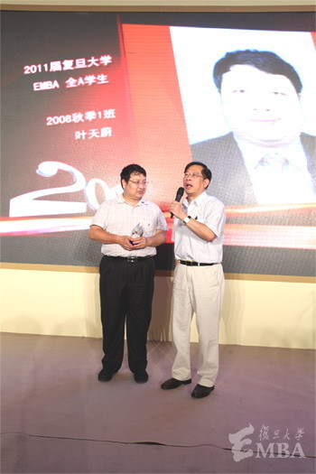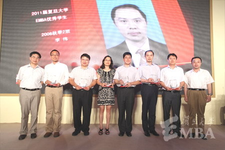两年多的校园生活,涌现了一批学习上的楷模,由复旦大学企业管理系系主任苏勇教授和复旦大学特聘教授、佳通轮胎(中国)投资有限公司执行董事沈伟家教授宣读并颁发2011届复旦大学EMBA优秀学生奖。这个奖项得来不易,要求获奖者所有课程成绩都在B以上,并且按照得A的成绩统计排名后,前5%的同学才能获得,此次共有12位同学获此殊荣。