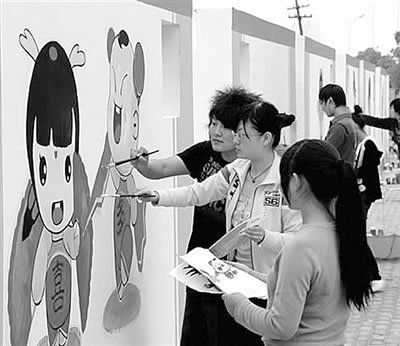 动漫节期间,当地大学生纷纷走上街头描绘动漫墙。
