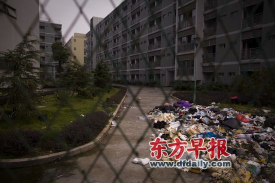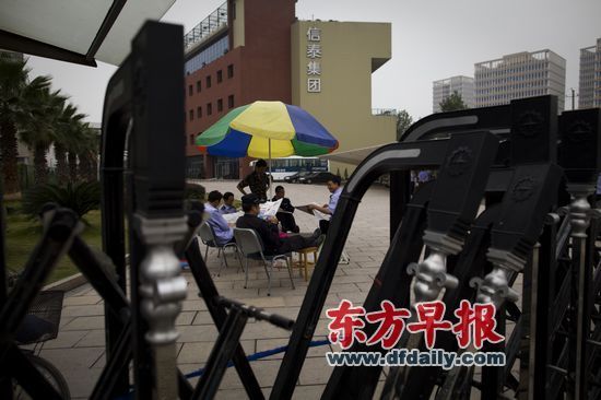 10月12日,温州,遭遇老板“跑路”危机的信泰集团仍大门紧闭,二十余名协警和 保安分三处守在厂门口,不准外人进入。 早报特派记者 贾代腾飞 图