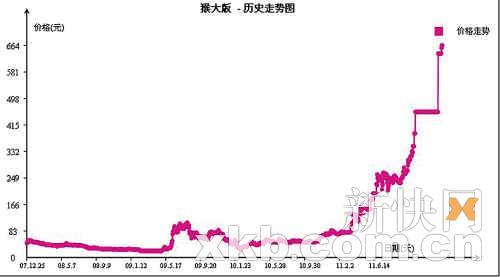 ■“猴大版”是2004年1月份发行的三轮猴大版票,面值19.20元,发行量216万版。2007年末至2009年中旬,价格一直徘徊在83元以下,随后价格有所上扬,但涨幅不大。到了2011年初,成功突破200元关口,然后一路上涨,目前已经涨到600元以上。10月14日最新报价为663元。