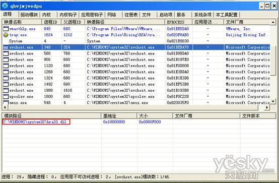2) 新的服务启动后,利用特殊手段让病毒映像替换svchost.exe,进程中看到的还是svchost.exe,似乎没有什么异样,但此时病毒已经将自己隐藏在svchost.exe里运行,病毒在这里完成的功能包括: